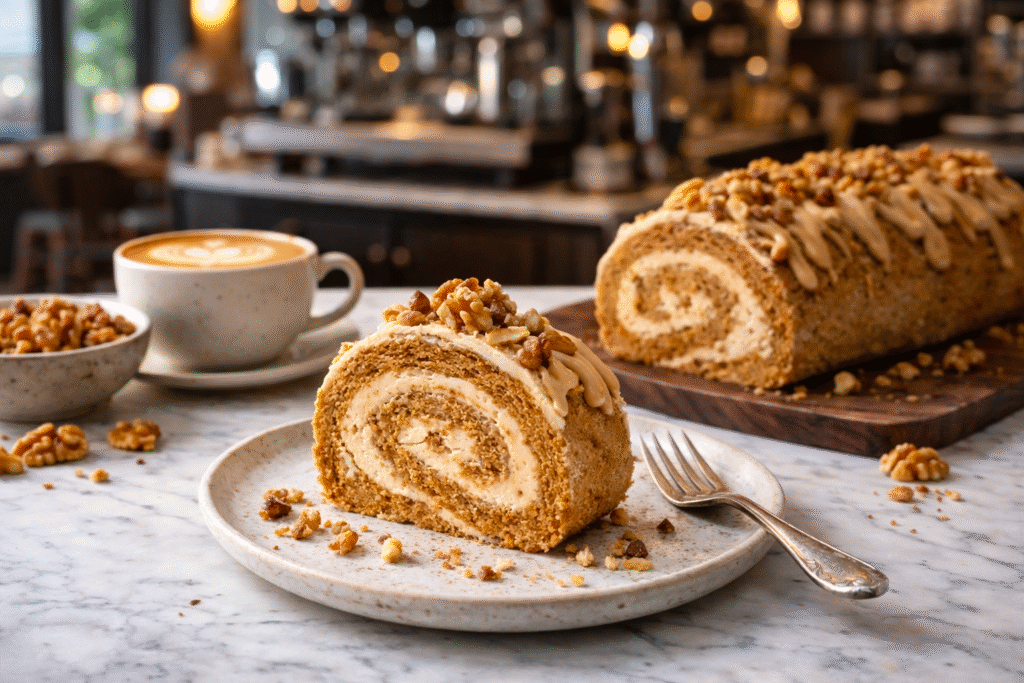 - Roládu odmotáme, namažeme krémem a srolujeme. Polijeme čokoládovou polevou a ozdobíme ořechy.